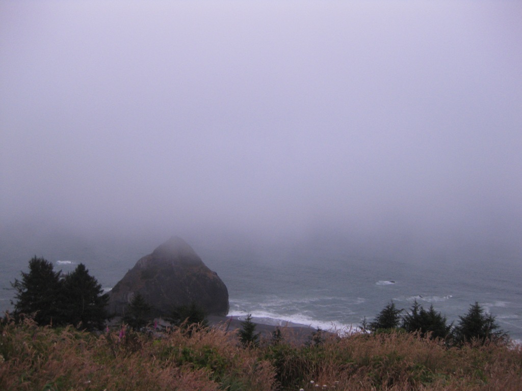 equally as impressive as James Irvine Trail. We were pretty beat at this point though, so it was a bit more of hiking to get back to the car, but we still enjoyed ourselves along the way. After this, we headed up to Crescent City and checked on a couple camp sites at their city visitor center. they told us that one site we were considering is insane with mosquitos (Lake Earl) so we decided against that one. We ate at the Pizza King, which was super good and cheap, so ifyou're in the area hiking or camping, this is a good spot to check out. then we went to our camp spot trailhead, Nickel Creek Walk-in. Its about a half mile hike to camp,which is an awesome hike up along a cliff at the edge of the ocean. The camp is by a creek that empties to the ocean so its in a small valley and only about 100 yards from the beach. THe beachhas an aweomse little arch in a rock, lots of driftwood, and tidepools during low tide. THis spot is free, with no reservations, but you're supposed to get a permit now for free, but we didn't have one and it wasnt' a problem. there's five sites, which are all pretty big and can fit a few tents each it seemed so sharing sites would be easy. the sunset here was awesome tonight-our first along the coast where we could see it actually (no fog, trees, or hills blocking it). we made a fire with driftwood, but mel went to bed early and i followed after a while. awesome, exhausting day.